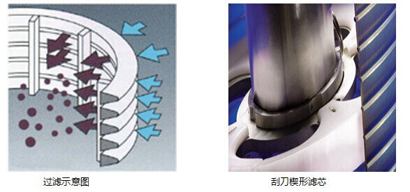 過(guò)濾器過(guò)濾單元采用V型設(shè)計(jì),流體能在壓力的推動(dòng)下,透過(guò)楔形濾芯表層,壓力逐漸增大,過(guò)濾精度也緩慢的提高,固體顆粒將被攔截濾芯表面,澄清的液體將從殼體排放,進(jìn)入下一道工序。